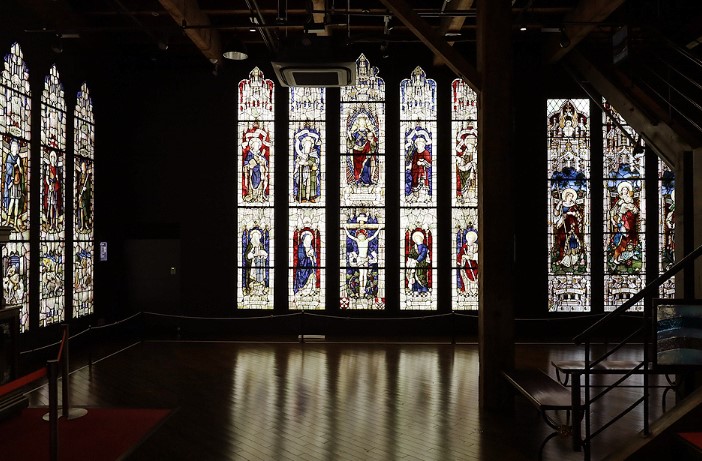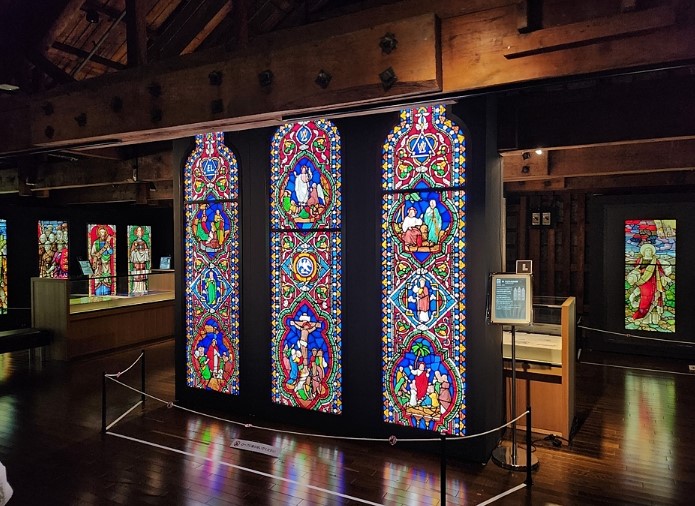 이곳은 다양한 스테인글라스 작품을 감상할 수 있는 공간으로, 일본에서는 사진 촬영이 허락되지 않는 경우가 많지만 이곳은 예외적으로 촬영이 가능했습니다. 아름다운 작품들을 배경으로 몇 장의 사진을 남길 수 있어 좋았습니다.