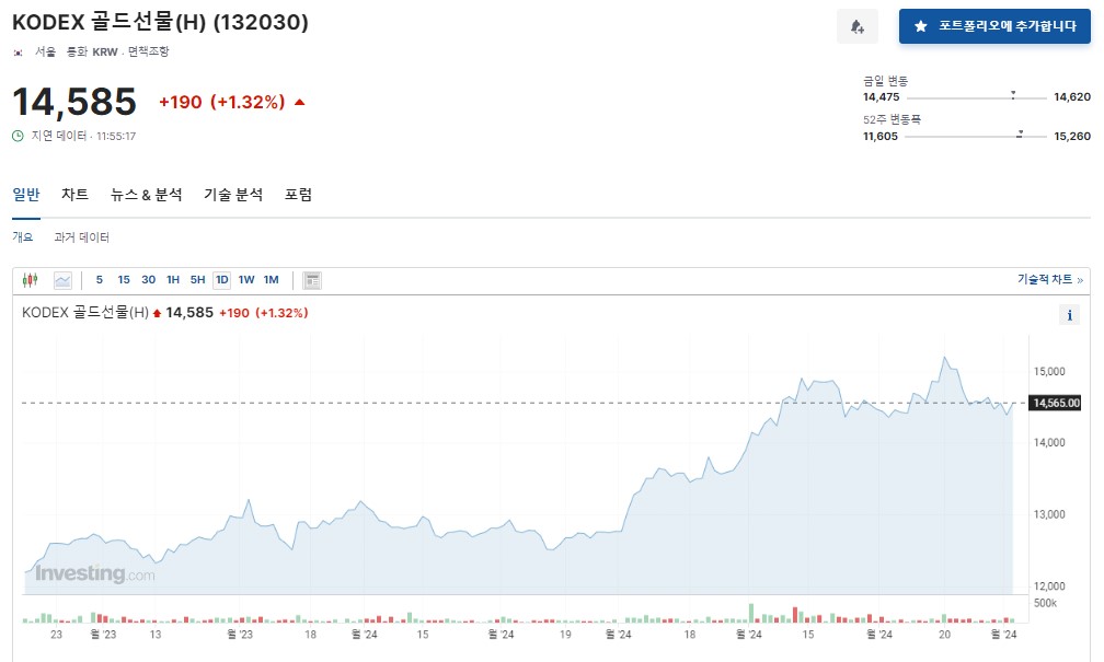 높은 변동성을 감수할 수 있다면: 삼성증권의 KODEX 골드선물(H) ETF도 고려할 만합니다. 금 선물 가격을 기준으로 하기 때문에 잠재적 수익이 높을 수 있지만, 그만큼 위험도 크다는 점을 유념해야 합니다.
