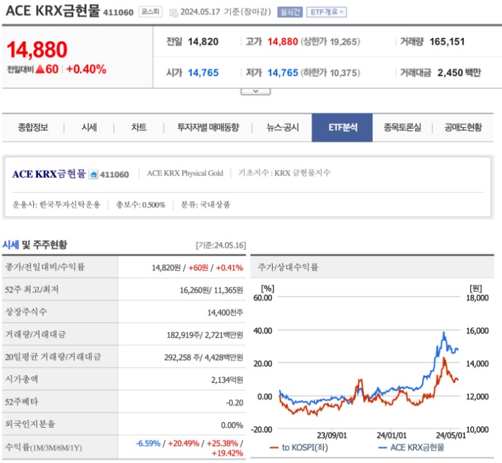 미래에셋의 ACE KRX 금현물 ETF는 최근 1년간 큰 수익을 올렸습니다. 주당 10,685원 하던 ETF 주가가 44% 넘게 올라 현재 15,000원대를 기록하고 있습니다.
