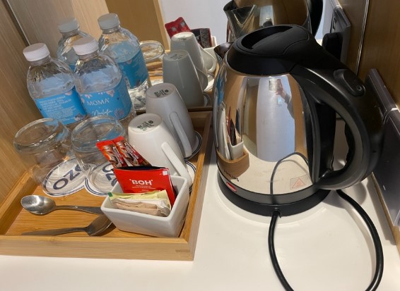 방에는 드라이기가 준비되어 있었는데, 출력이 좋아서 한국에서 사용하는 드라이기와 비교해도 손색이 없었습니다. 또한 커피포트와 함께 물, 커피, 차가 준비되어 있어 아침에 간편하게 음료를 즐길 수 있었습니다. 이런 작은 배려들이 여행의 품질을 높여줍니다.
