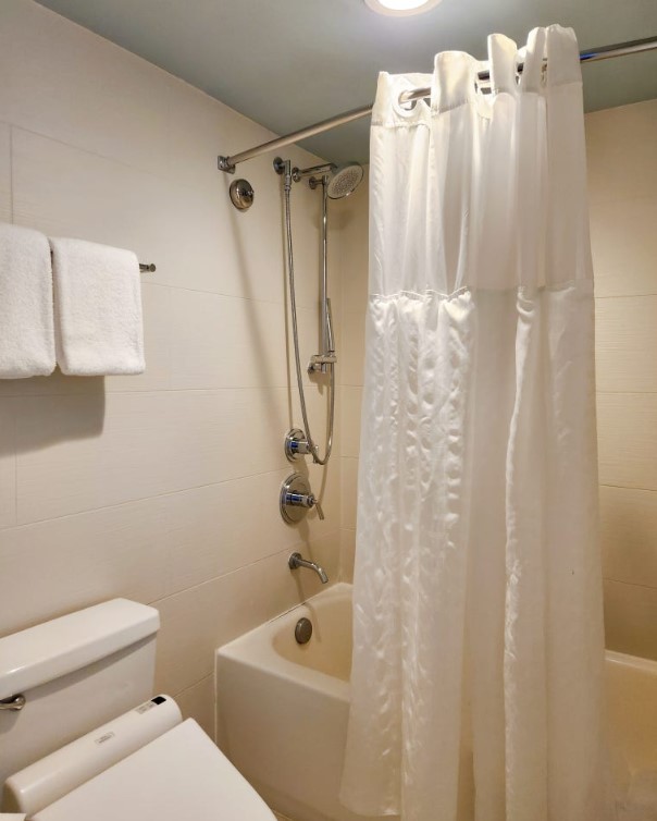 욕조에는 샤워커튼이 설치되어 있어 반신욕을 즐기기에도 좋았고, 청결 상태도 매우 뛰어났습니다. 샤워커튼이 물에 닿는 부분이라 얼룩이 생기기 쉬운데, 관리가 철저히 되어 있었고 매우 깔끔하게 유지되어 있었습니다.