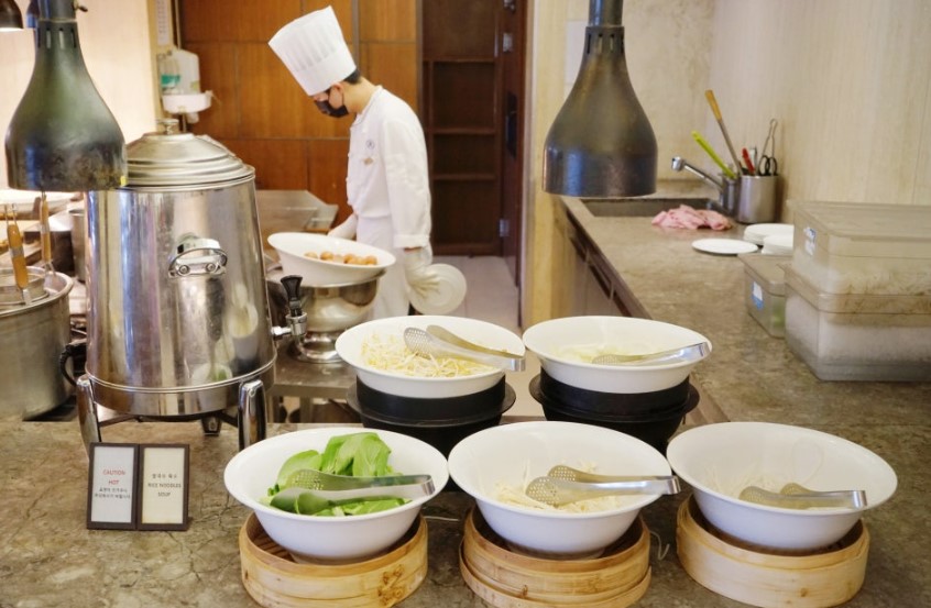 쌀국수부터 전복죽, 잡채 등 한식 메뉴가 준비되어 있었고, 다양한 종류의 빵, 머핀 같은 베이커리 메뉴도 풍부하게 제공되었습니다.