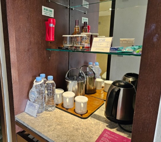 객실 내에는 물 3병과 컵 3개가 기본 제공되었고, 커피 머신과 함께 카누 커피도 준비되어 있어 아침에 간편하게 커피 한 잔을 즐길 수 있었습니다.