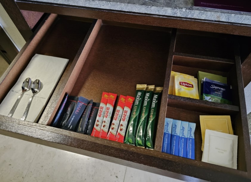 객실 내에는 물 3병과 컵 3개가 기본 제공되었고, 커피 머신과 함께 카누 커피도 준비되어 있어 아침에 간편하게 커피 한 잔을 즐길 수 있었습니다.