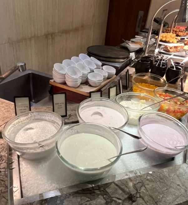 또한 신선한 과일과 함께 요플레도 종류가 다양하게 준비되어 있었습니다. 블루베리, 딸기, 복숭아, 플레인 등 아이들이 좋아하는 다양한 맛의 요플레가 있어서 아침 식사 후 디저트로도 충분했습니다.