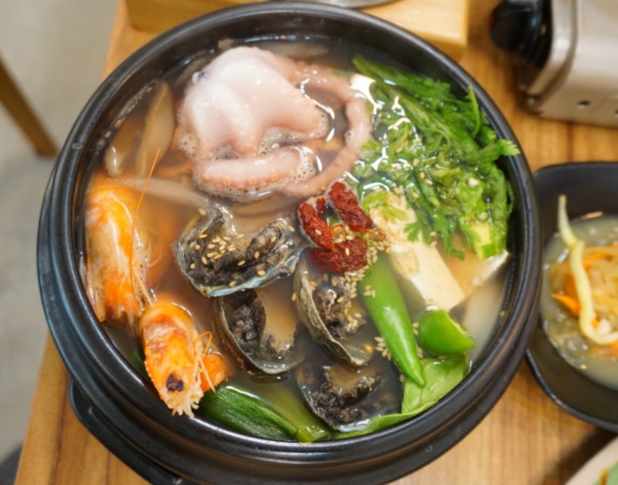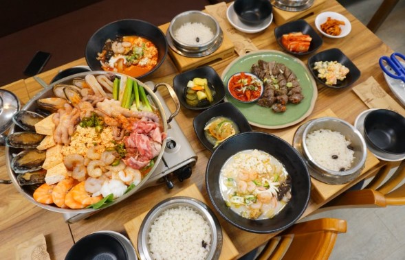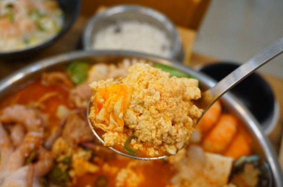 미리 전화를 통해 주문한 덕분에, 자리에 앉자마자 반찬이 나오고 얼마 지나지 않아 메인 메뉴인 모듬짬뽕순두부전골이 나왔습니다. 얼큰한 육수에 다양한 해산물이 듬뿍 올라가 있어 군침이 도는 비주얼이었습니다.