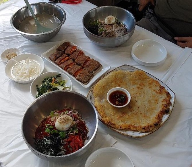 메뉴는 칼칼한 칼국수와 비빔막국수, 회막국수 등 다양하게 주문했습니다. 김이 모락모락 나는 수육과 갓 구운 감자전은 그 자체로 군침을 돌게 만들었습니다.