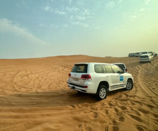 투어 당일 오후가 되면, 지정된 시간에 맞춰 차량이 숙소로 픽업 옵니다. 고성능 4WD 차량에 탑승하고 한 시간 정도 달리다 보면 광활하게 펼쳐진 모래 사막에 도착하게 됩니다.