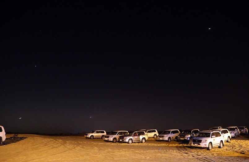 저녁 프로그램이 끝나면 차량으로 돌아가기 전, 별이 가득한 사막 하늘을 감상할 시간을 가집니다. 두바이는 도시 불빛이 강해 별을 보기 어려운 편이지만, 사막에서는 하늘이 맑고 어두워져 별빛이 쏟아집니다. 사막의 밤하늘 아래에서 여유롭게 시간을 보내며 낭만적인 기분을 만끽할 수 있습니다.