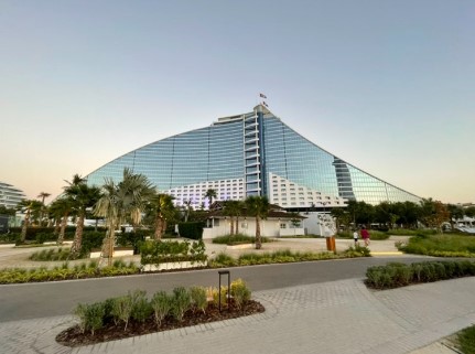 호텔에 도착하자마자 고급스러운 외관이 눈길을 사로잡았습니다. 두바이의 상징적인 버즈 알 아랍이 가까이 보이며, 건축 디자인이 주변의 푸른 바다와 조화를 이루는 모습이 정말 멋있었어요.