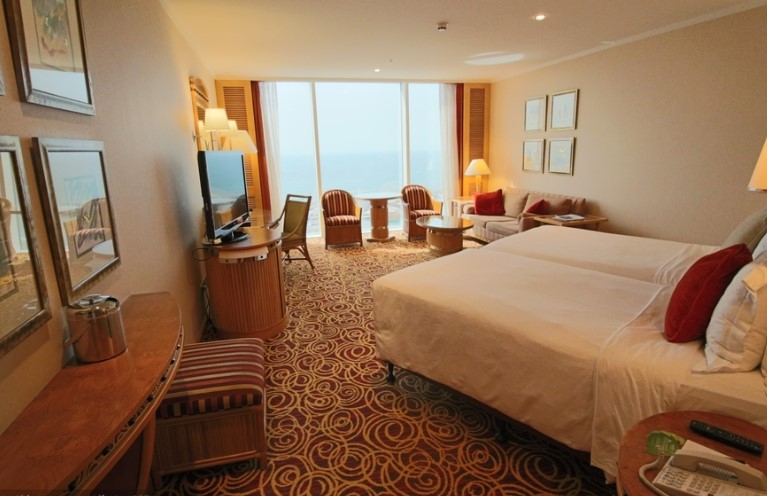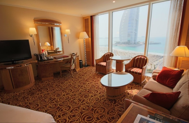 제가 묵은 오션뷰 객실은 입실하자마자 창밖으로 펼쳐진 바다와 버즈 알 아랍의 전경이 한눈에 들어와 감탄이 절로 나왔습니다. 객실은 넓고 현대적인 인테리어로 꾸며져 있었고, 아늑하고 고급스러운 분위기 덕분에 편안하게 쉴 수 있었어요.