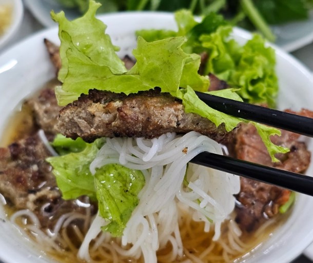 분짜는 따뜻한 느억맘 소스에 떡갈비 같은 고기가 들어간 요리로, 면의 양이 상당히 많아 푸짐하게 즐길 수 있었습니다. 특히 고기는 베이컨 같은 맛도 느껴져 독특한 조화를 이룹니다.