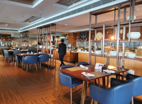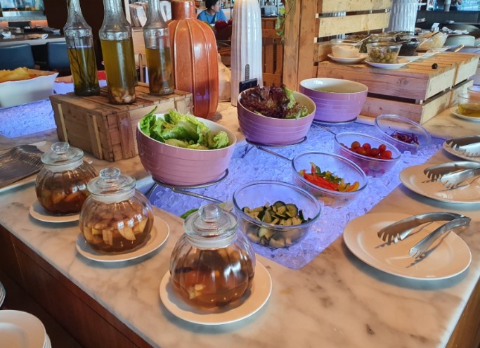 조식에서 가장 인상 깊었던 것은 신선한 재료로 만든 샐러드와 즉석에서 만들어주는 쌀국수, 그리고 달콤한 과일과 디저트류였습니다. 특히, 오믈렛 스테이션에서는 개인 취향에 맞는 토핑을 선택해 바로 요리해주는 점이 좋았습니다.
