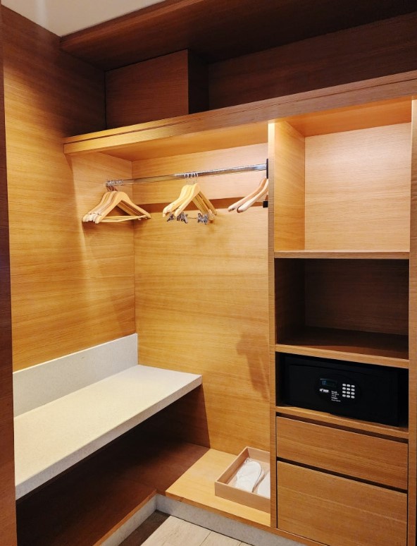 욕실 내에는 옷장과 수납함이 함께 있어 짐 정리가 용이했습니다. 특히 장기 투숙 시 매우 유용했으며, 옷을 깔끔하게 정리할 수 있었습니다. 단, 수영복이나 젖은 옷을 널어놓을 공간이 부족했던 점은 아쉬웠습니다.