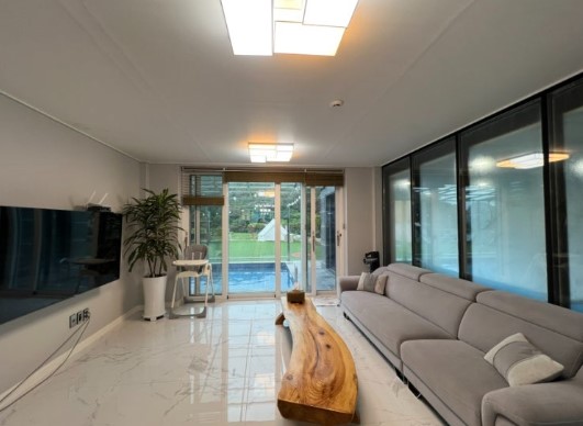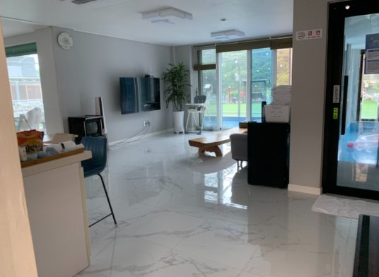 입실 절차는 간단했어요. 안내소에서 친절한 사장님께 설명을 듣고 B동으로 이동했습니다. 입구에 들어서자마자 보이는 거실은 정말 넓고 쾌적했어요.