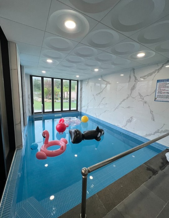 1층에는 넓은 실내 수영장이 마련되어 있어 가족들이 물놀이를 즐기기에 충분했습니다. 무엇보다 수영장 안에도 별도의 화장실이 있어서, 물놀이 도중에도 편리하게 이용할 수 있었습니다.