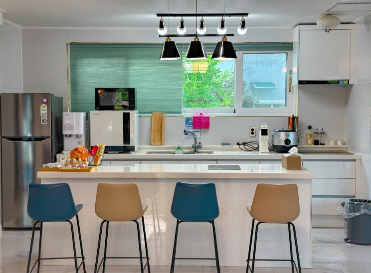 얼음 정수기와 식기 건조기가 구비되어 있어 편리했습니다. 아이들을 위한 식기류도 넉넉히 준비되어 있었던 점이 특히 마음에 들었습니다.
