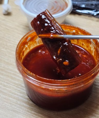 다락방과메기의 초장은 일반 시판용 초장과는 달랐습니다. 살짝 새콤하면서도 감칠맛이 풍부한 수제 스타일 초장이었어요. 뚜껑도 튼튼한 플라스틱으로 되어 있어 사용하기 편리했습니다.