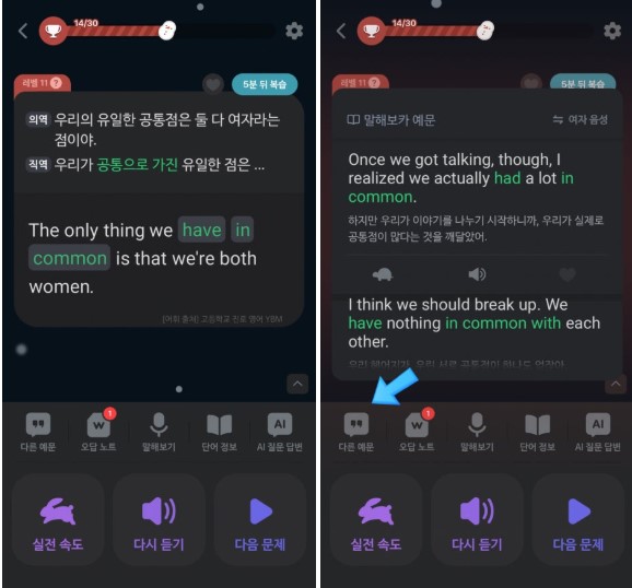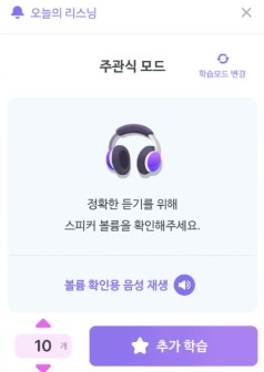 이처럼 구체적인 결과를 제공하니 학습 동기가 더욱 생깁니다. 또한, 단어를 학습할 때 성우의 문장을 들으며 '듣기 평가 속도'를 조절할 수 있고, 필요한 경우 '다시 듣기'를 통해 확실히 익힐 수 있습니다.