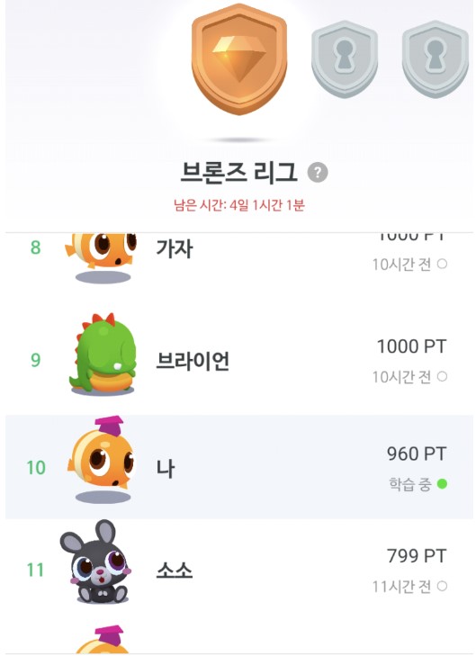 말해보카의 리그 시스템은 승부욕을 자극합니다. 상위 10명은 승급하고, 하위 5명은 강등됩니다. 이 시스템 덕분에 매일 도전 과제를 달성하고, 리그전에서 승급을 목표로 꾸준히 학습하고 있습니다.