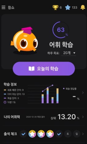 틀린 문제는 "오답노트"에서 복습하며 새로운 어휘 정보도 습득할 수 있습니다. 특히, 도전 과제를 통해 "다이아"를 얻고 이를 캐릭터 꾸미기에 사용할 수 있어 재미를 더해줍니다.