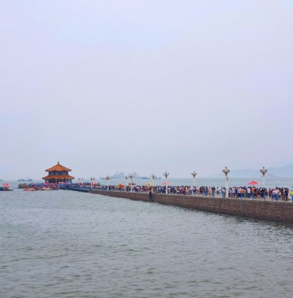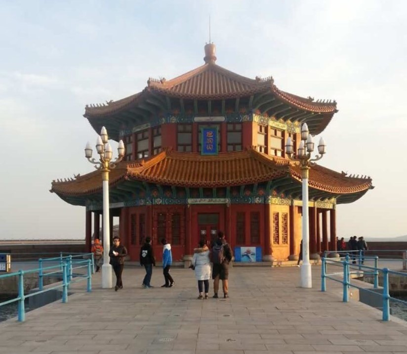잔교를 걷다 보면 끝자락에 위치한 천막성이라는 전통적인 건축물이 눈에 들어옵니다. 이곳은 칭다오의 대표적인 사진 명소로, 바다와 어우러진 아름다운 전경을 즐길 수 있습니다.
