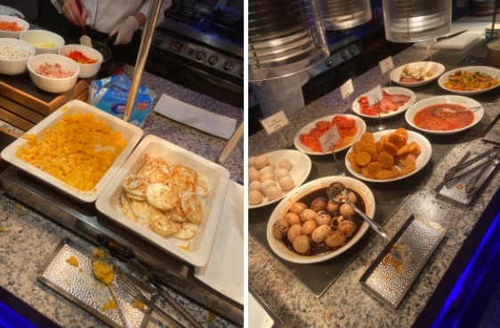 베이커리 코너에서는 신선한 크로와상과 각종 잼이 준비되어 있었고, 다양한 메뉴가 제공되는 가운데 눈길을 끄는 요리들이 많았습니다.