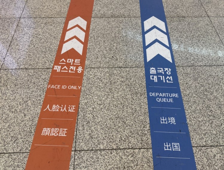 출국 게이트로 가면 스마트패스 전용 라인이 표시되어 있습니다. 바닥에 "스마트패스 전용" 문구가 보이는 라인으로 가면, 기계에서 얼굴 인식과 여권, 탑승권 확인이 빠르게 진행됩니다. 사람과 대면으로 진행되던 절차를 기계가 대신 처리해주므로, 대기시간이 크게 단축됩니다.