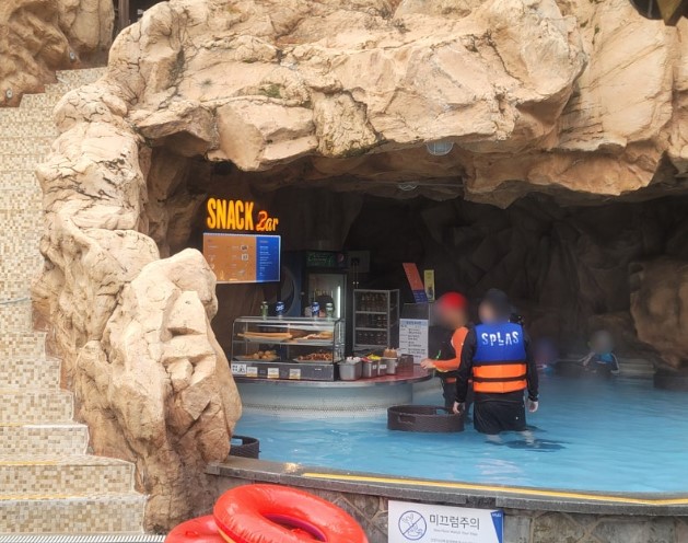 물속에서 간식을 즐길 수 있는 스낵바도 있어서 재미있었어요. 실외 스파 케이브존 1층에 위치해 있어, 물놀이 중간중간에 츄러스나 핫도그 같은 간식을 즐기며 잠깐 휴식을 취할 수 있었습니다.
