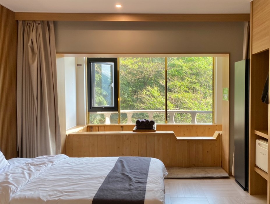 편백나무의 은은한 향기가 물에 스며들어 목욕을 하며 힐링하기에 딱 좋았습니다. 창밖으로 보이는 숲 풍경은 일본의 노천온천에 온 듯한 착각을 불러일으킬 만큼 아름다웠습니다.