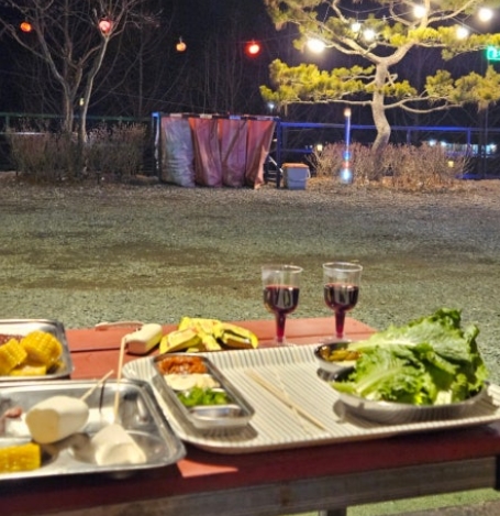 바베큐는 공용 바베큐장에서 즐길 수도 있지만, 저희는 프라이빗한 분위기를 위해 글램핑장에서 개별 바베큐를 선택했어요.