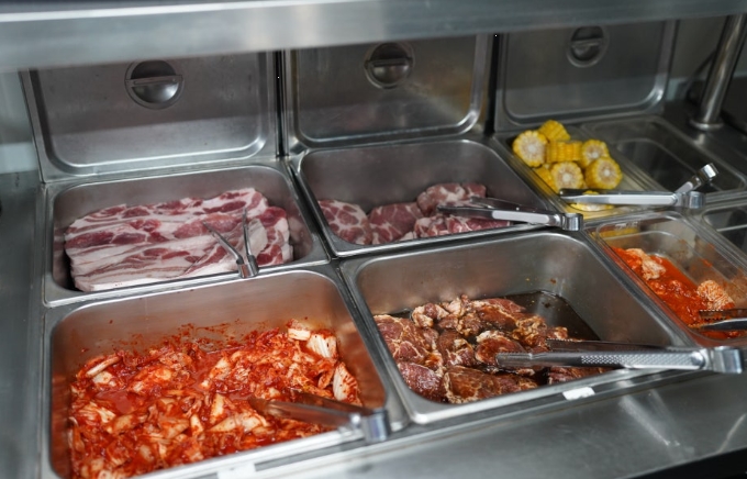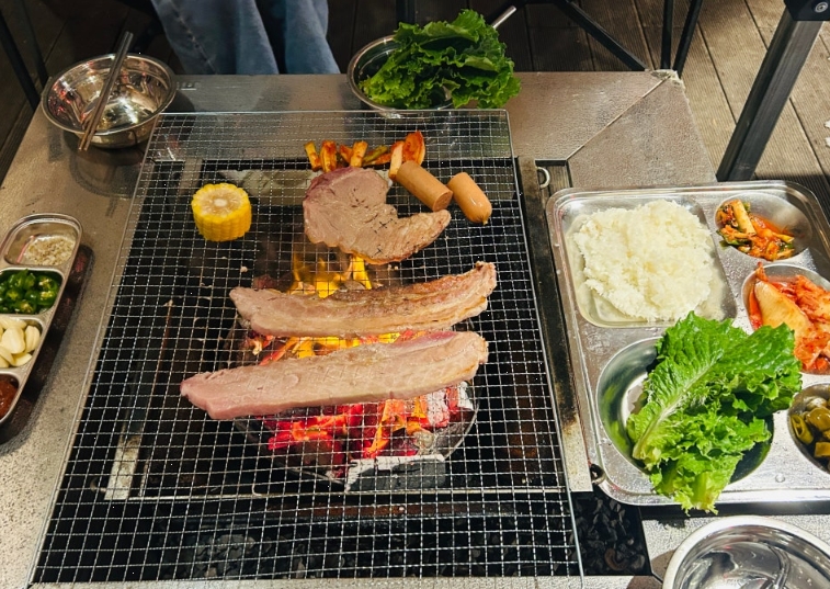 이곳에서는 삼겹살, 목살, 양념목살, 닭고기, 소시지, 옥수수 등 다양한 메뉴를 무제한으로 즐길 수 있습니다. 또한 김치, 밥, 쌈장, 마늘 등 고기와 함께 먹기 좋은 반찬들도 무제한 제공돼 더욱 풍성한 식사가 가능했어요.
