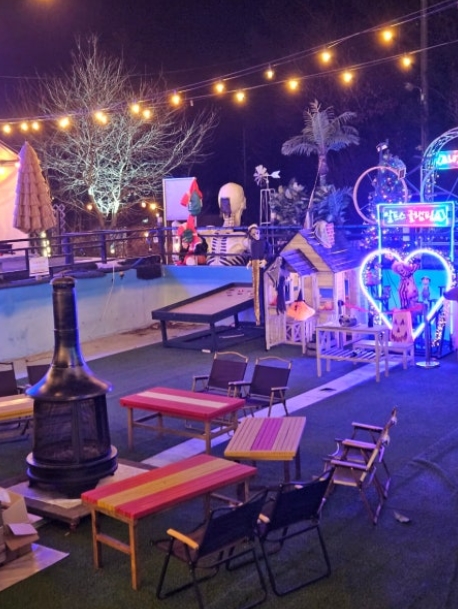 청양 알프스마을의 넓은 야외 공간에서 별빛을 보며 바베큐를 즐기니 정말 유럽 알프스에 온 것 같은 기분이 들었습니다. 특히 밤에는 더욱 로맨틱한 분위기를 느낄 수 있어요.