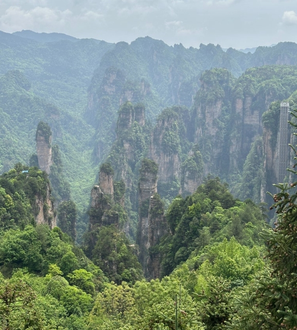 엘리베이터를 타고 올라가는 동안 유리창을 통해 장가계의 웅장한 절벽들이 눈앞에 펼쳐졌고, 순간 숨이 멎을 것 같은 감동이 밀려왔습니다.