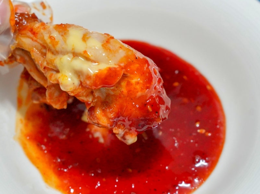 고추바사삭 치킨은 단독으로 먹어도 맛있지만, 마요네즈 소스스위트 칠리 소스와 함께 곁들여 먹으면 매운맛이 부드러워지면서 색다른 조합을 즐길 수 있습니다.