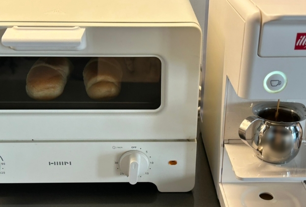 아침에는 간단한 빵 생지가 제공되는데, 오븐에 구워서 먹으면 정말 맛있어요.