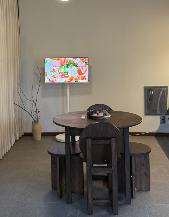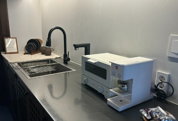 이곳은 취사가 불가능하지만, 대신 예쁘고 감성적인 주방이 마련되어 있어요. 주방에는 전자레인지, 커피포트, 일리 커피 머신, 정수기 등 기본적인 시설이 갖춰져 있어서 불편함이 없었어요.