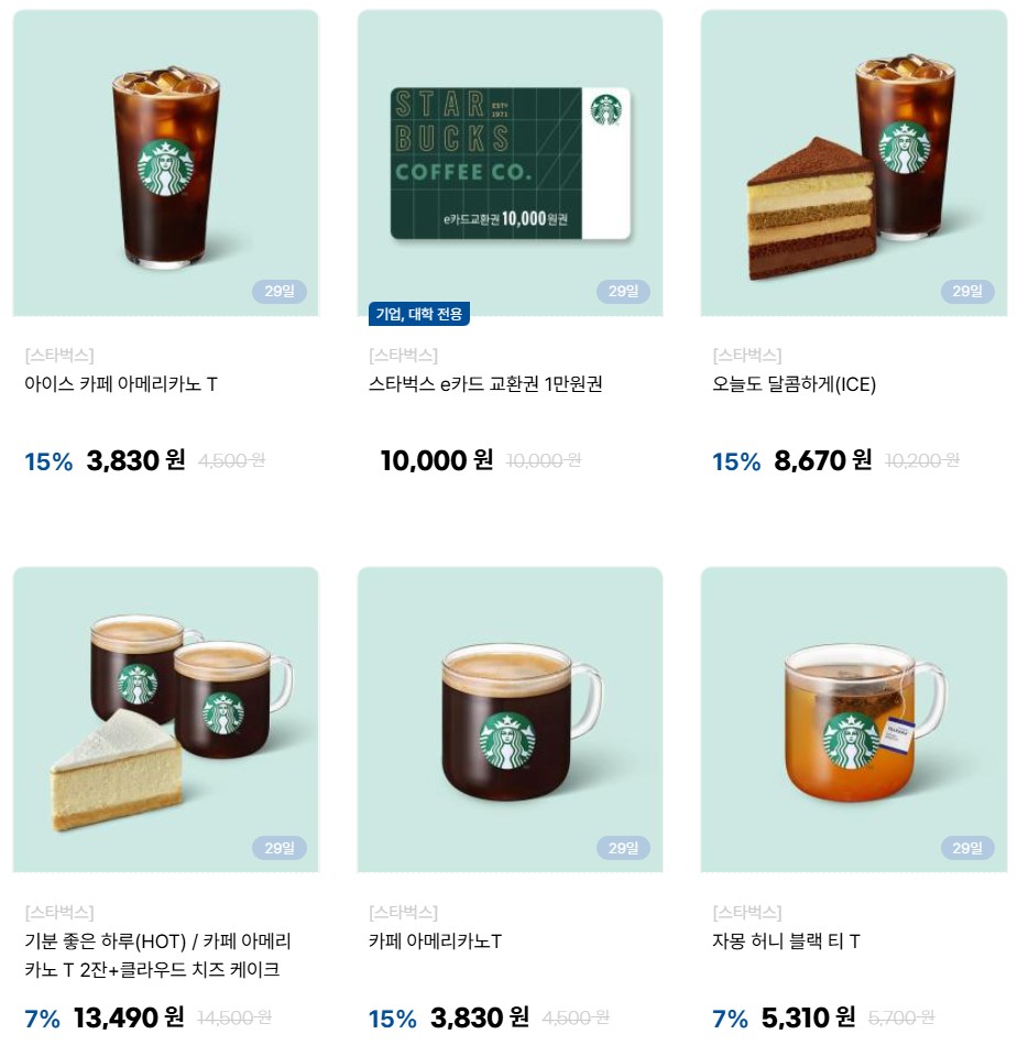 로그인 후, 원하는 기프티콘을 선택합니다. 다양한 종류의 스타벅스 기프티콘이 준비되어 있으므로, 받는 사람의 취향에 맞는 제품을 선택할 수 있습니다.