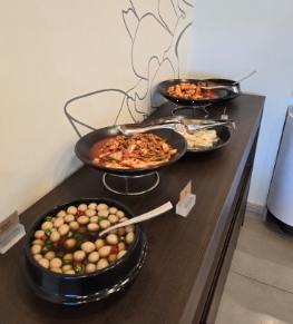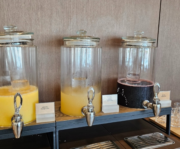 주스는 세 가지 종류가 제공되었고, 커피머신도 있어서 라떼 등 다양한 커피를 즐길 수 있었습니다.