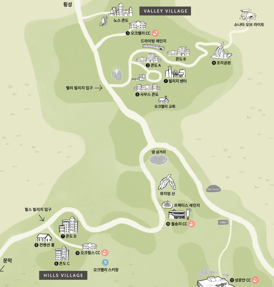 네이버 지도에서 ‘오크밸리 리조트’를 검색하면 밸리 빌리지가 나오고, ‘오크밸리 스키장’을 검색하면 힐스 빌리지가 나옵니다. 처음 가시는 분들은 이 점 참고하세요.