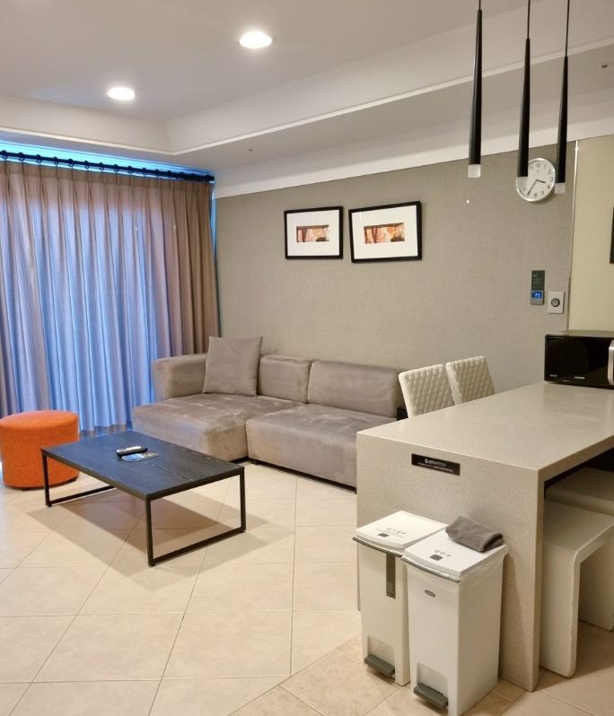 거실 겸 주방 1개, 침대방 1개, 온돌방 1개, 화장실 2개로 구성되어 있습니다. 거실이 꽤 넓어서 짐을 풀어도 여유로운 공간이 남아있었고, 테이블과 소파가 있어서 가족 단위로 지내기에 적합했어요.