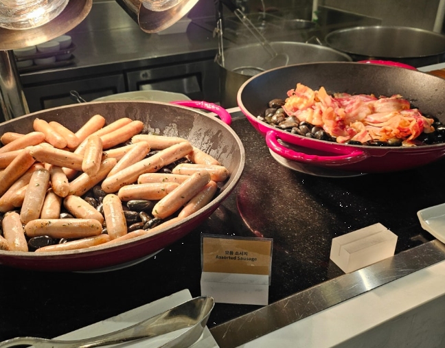 햄과 치즈도 다양한 종류가 있었어요. 빵과 함께 곁들여 먹기 좋은 맛있는 햄과 치즈들! 그리고 동그란 치즈는 정말 맛있어서 한 번 더 먹고 싶었네요. 핫 푸드 코너에서는 불고기, 생선요리, 감자국 등 여러 가지 따뜻한 음식들이 준비되어 있어서 식사에 더욱 풍성함을 더해줬습니다.