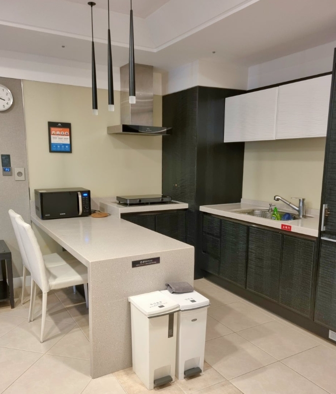 주방 공간은 깔끔하게 정리되어 있었고, 간단한 취사가 가능했습니다. 전자레인지, 인덕션, 커피포트는 기본 제공되었어요.