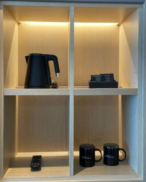 객실에는 미니 냉장고가 준비되어 있었고, 무료 생수 두 병과 커피, 차 티백도 제공되었습니다.