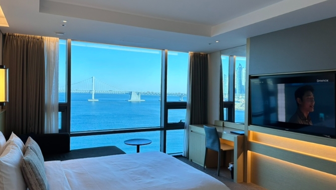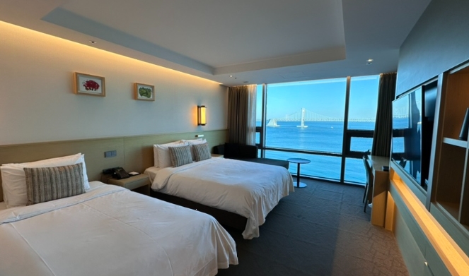 디럭스 트윈 오션뷰 객실 소개: 바다와 광안대교를 한눈에