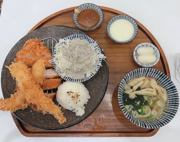 우리는 에비텐 모듬가츠와 치즈모듬가츠를 주문했어요. 에비텐 모듬가츠에는 돈가츠, 새우튀김 2개, 샐러드, 밥, 소우동, 연유치즈떡이 포함되어 있었습니다.