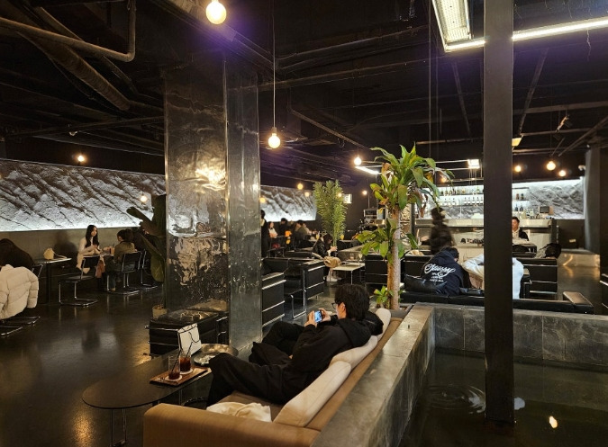 카페 내부는 콘크리트 벽과 우드톤 가구들이 어우러져 모던한 감성을 자랑합니다. 조명이 따뜻한 색감이라 전체적으로 아늑한 분위기가 돋보였어요.