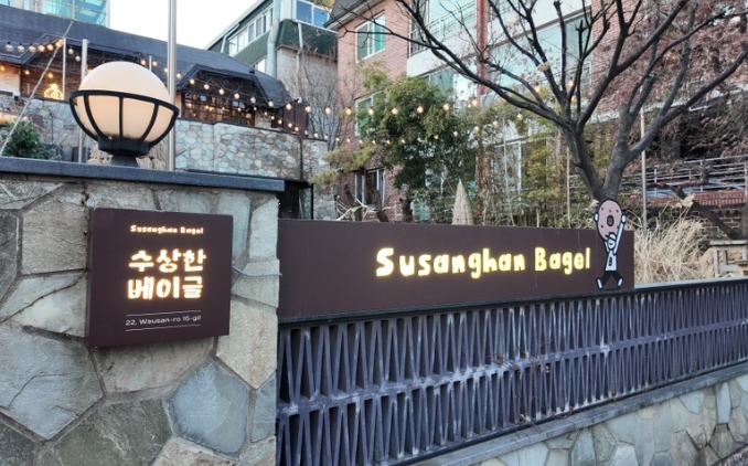 '수상한베이글'은 조금 골목 안쪽에 위치해 있었지만, 도착하자마자 문 앞에서 풍기는 고소한 베이글 굽는 냄새가 기대감을 한껏 높여줬습니다.