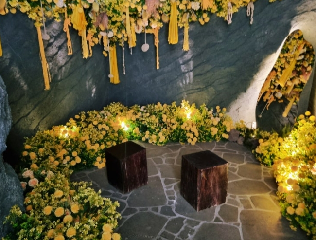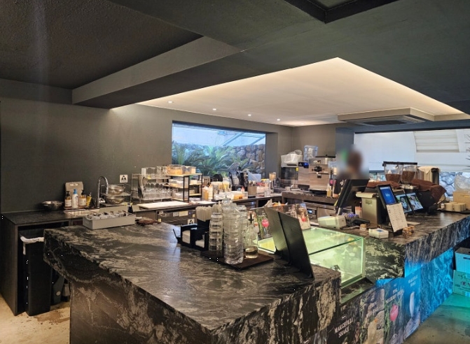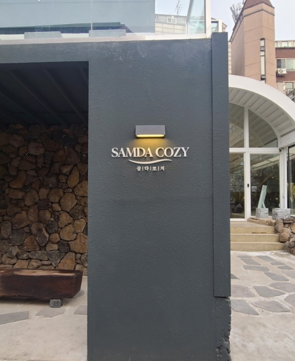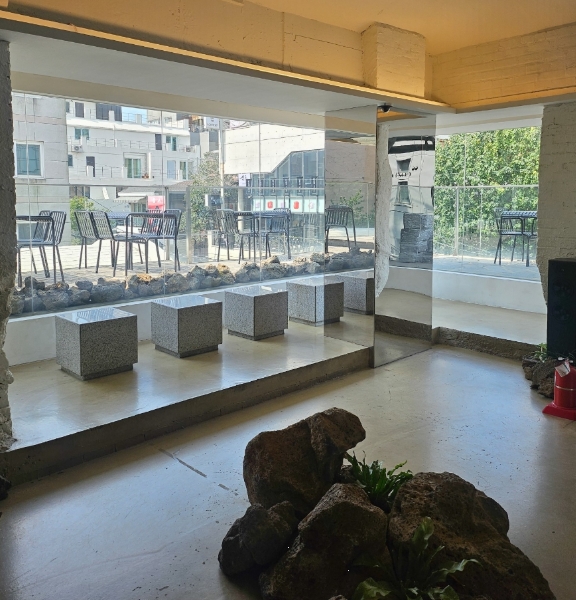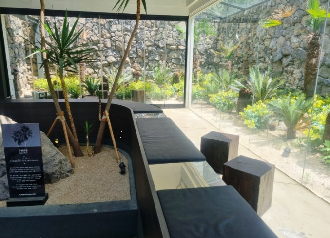 문을 열고 들어서는 순간, 야자수와 화산석, 초록빛 식물들이 가득한 공간이 마치 제주도의 작은 정원에 온 듯한 기분을 들게 했어요.