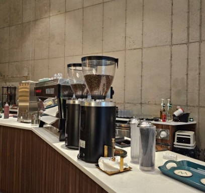 한쪽 벽면에는 커피 원두와 드립 도구들이 전시되어 있어서 커피를 좋아하는 사람이라면 흥미롭게 구경할 수 있는 요소도 있었습니다.